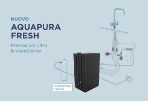 Aquapura Fresh ha un comando per acqua naturale a temperatura ambiente, naturale fredda o frizzante fredda e rappresenta una soluzione d'incasso che permette di lasciare liberi i piani d'appoggio grazie alla vasta gamma di colonnine ad azione manuale che lo completano.