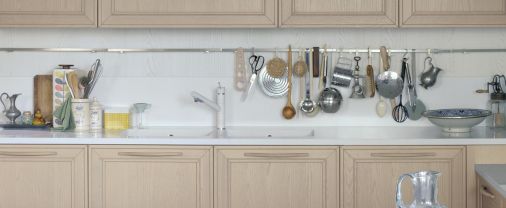 Schock® presenta la combinazione di due lavelli da cucina Solido N100 in Cristalite Plus saldati sottotop con un effetto a scomparsa totale e il miscelatore Aquaflex nella colorazione Bianco Alpina installati in una cucina Essence di Veneta Cucine.